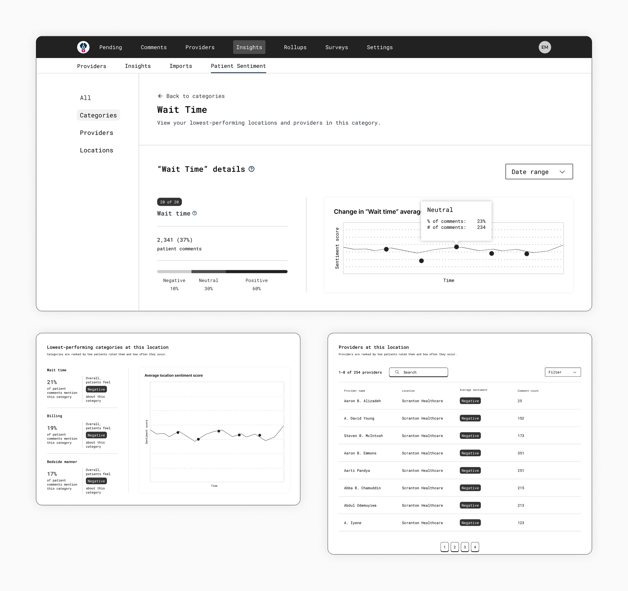 Analytics dashboard—The dashboard served as a jumping-off point for different data types, whether at a health system level, comment categories, or providers.