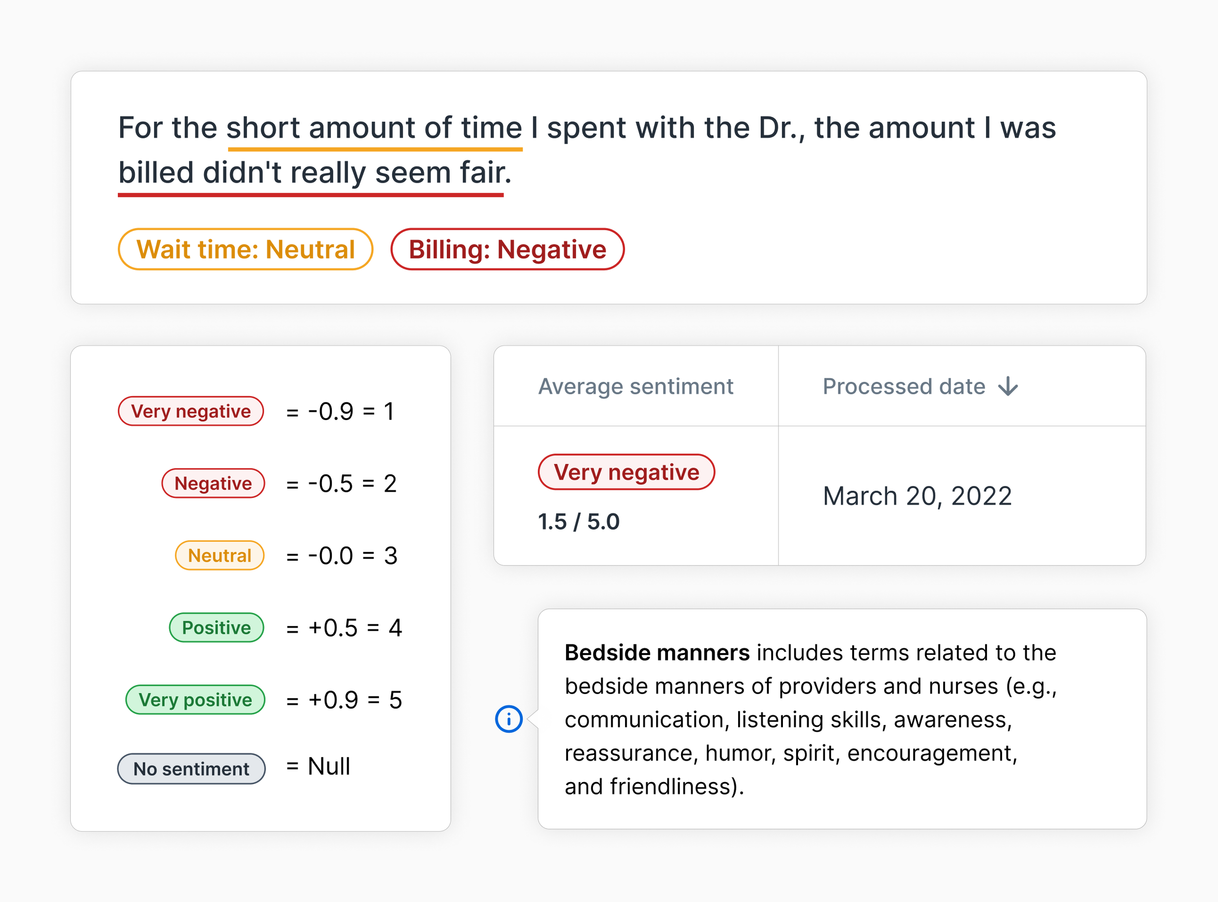 Our MVP leveraged aspect-based sentiment analysis, identifying how positively or negatively a patient felt about their experience.