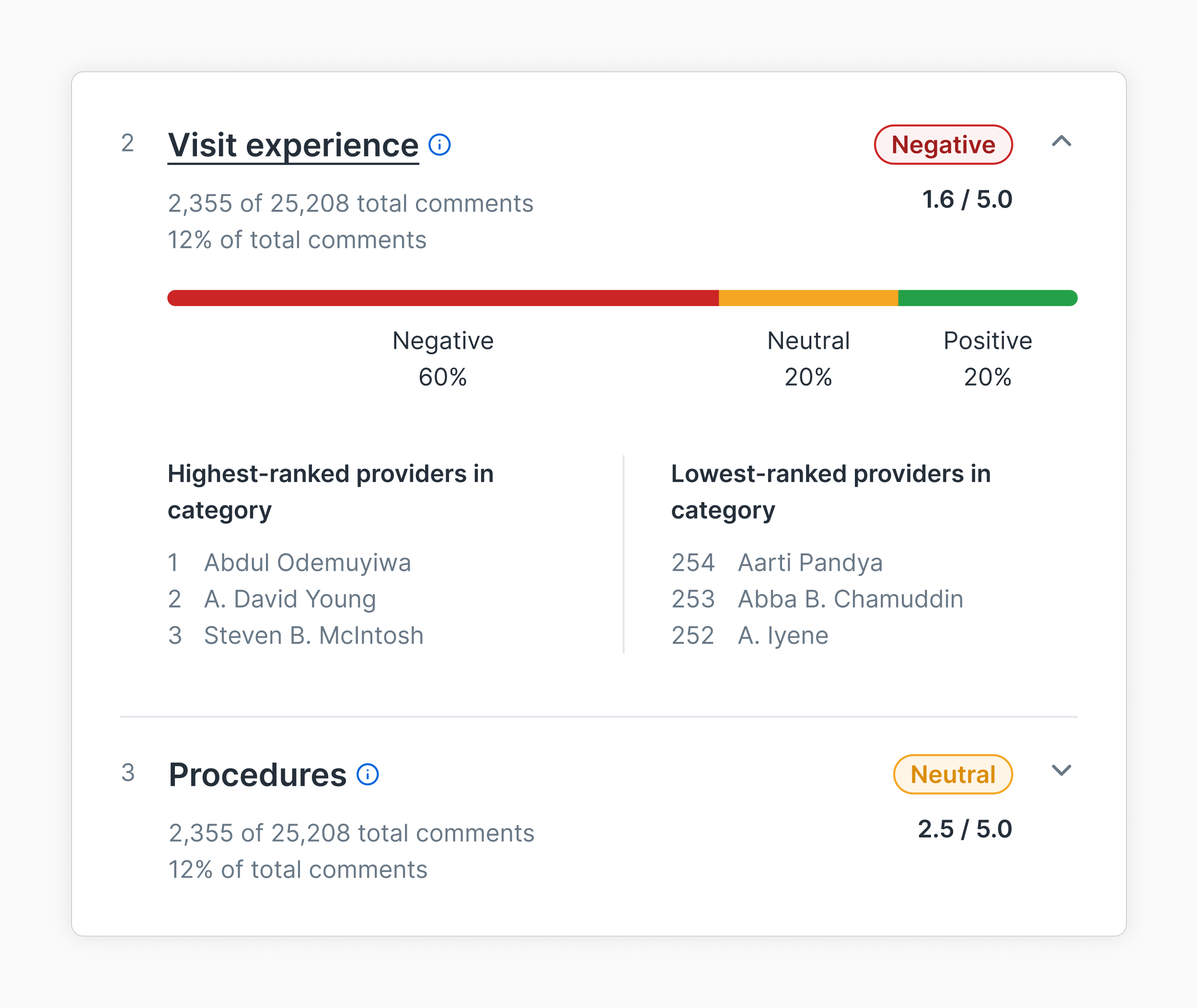 Ranked categories list—This ranked category list shows the three highest-rated categories at a given health system during a specific date range. It allows users to get an overview of category performance while drilling down for more detail.